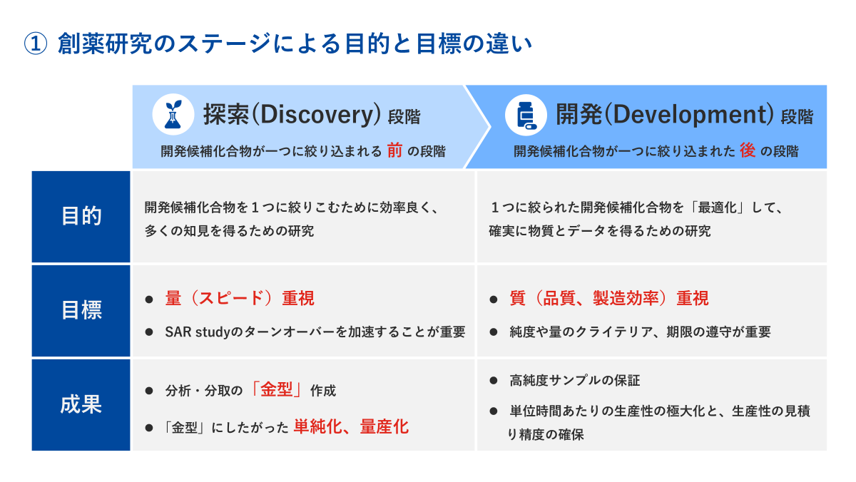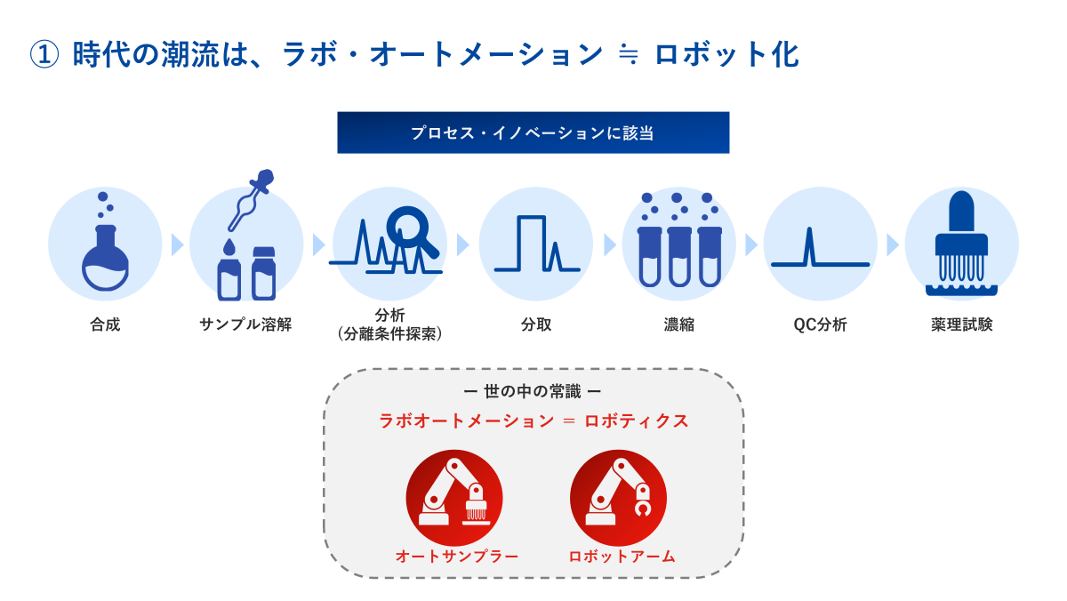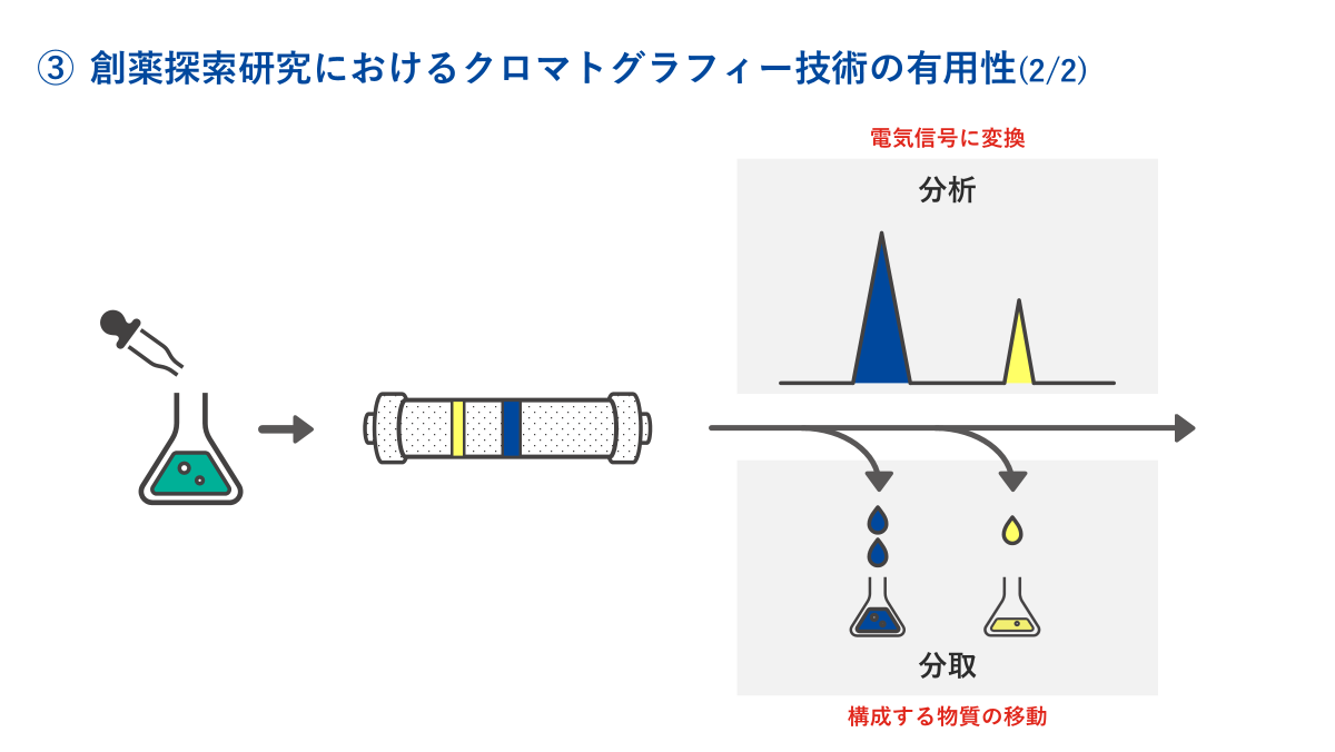 これ以降は、我々のお客様のボリュームゾーンである、創薬探索研究におけるクロマトグラフィー技術およびその工程全体を変革する意義について述べていきます。