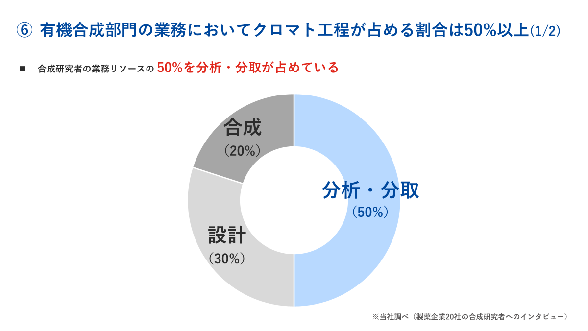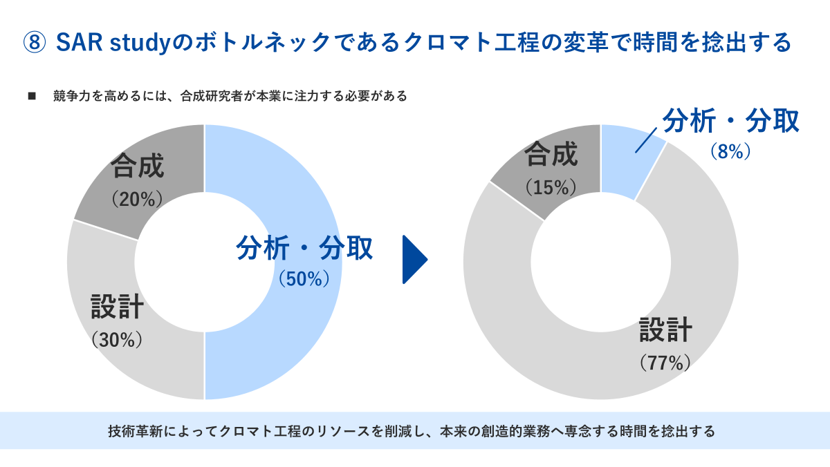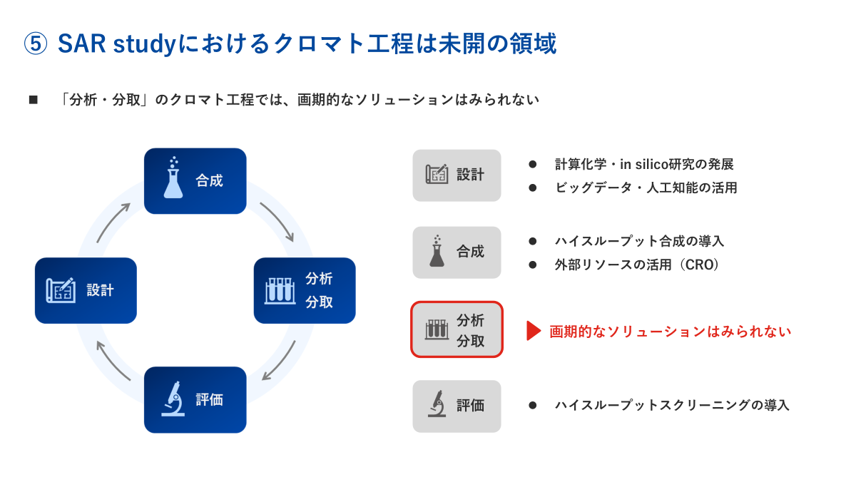 我々は、SAR studyに欠かせない4つの要素について解析したところ、【分析・分取】すなわちクロマト工程が手つかずの状態にあると判断しました。