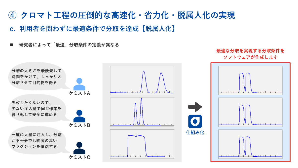 創薬研究の日常に欠かせない、クロマトグラフィー業務に要する膨大な労力から研究者を解放し、創造的な業務に充てる時間を捻出する