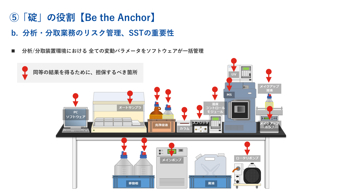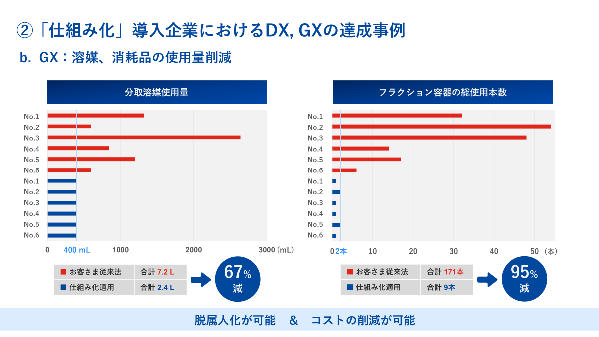 これに対して「仕組み化」を導入してから約半年後では、部門全体としておよそ8%までに削減できたと聞いております。利用者の経験値を問わず、僅か数回のPC画面上のクリック操作だけで複雑で属人的なクロマト工程を完了できる証左です。