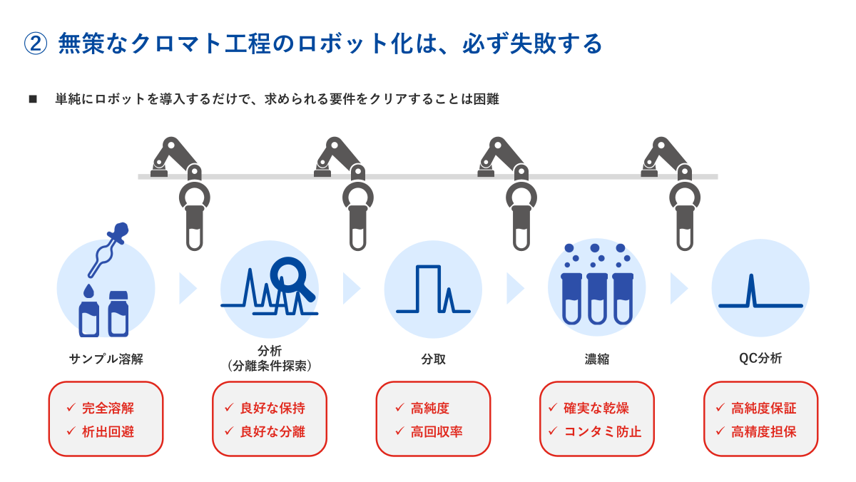 これまで述べてきた通り、ラボ・オートメーションと同義であるロボット化を実現するためには、研究サイクルのボトルネックであるクロマト工程について十分に要件定義することが必要です。闇雲なロボット化に着手しても失敗は自明です。