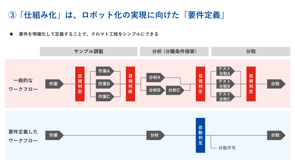 第二段階として、仕組み化によって極限まで要件定義されたクロマト工程であれば、ロボット化に移行が可能です。