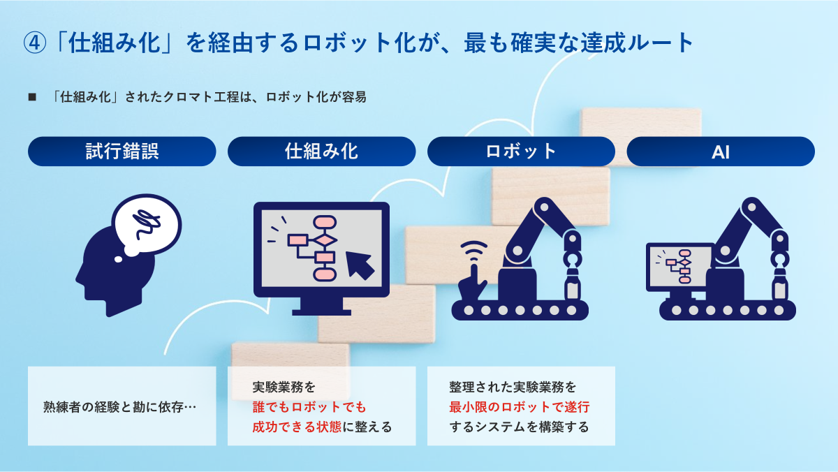 第一段階として、研究者が試行錯誤している現状のクロマト工程を「仕組み化」して、誰でもロボットでも成功できる状態にしなければなりません。