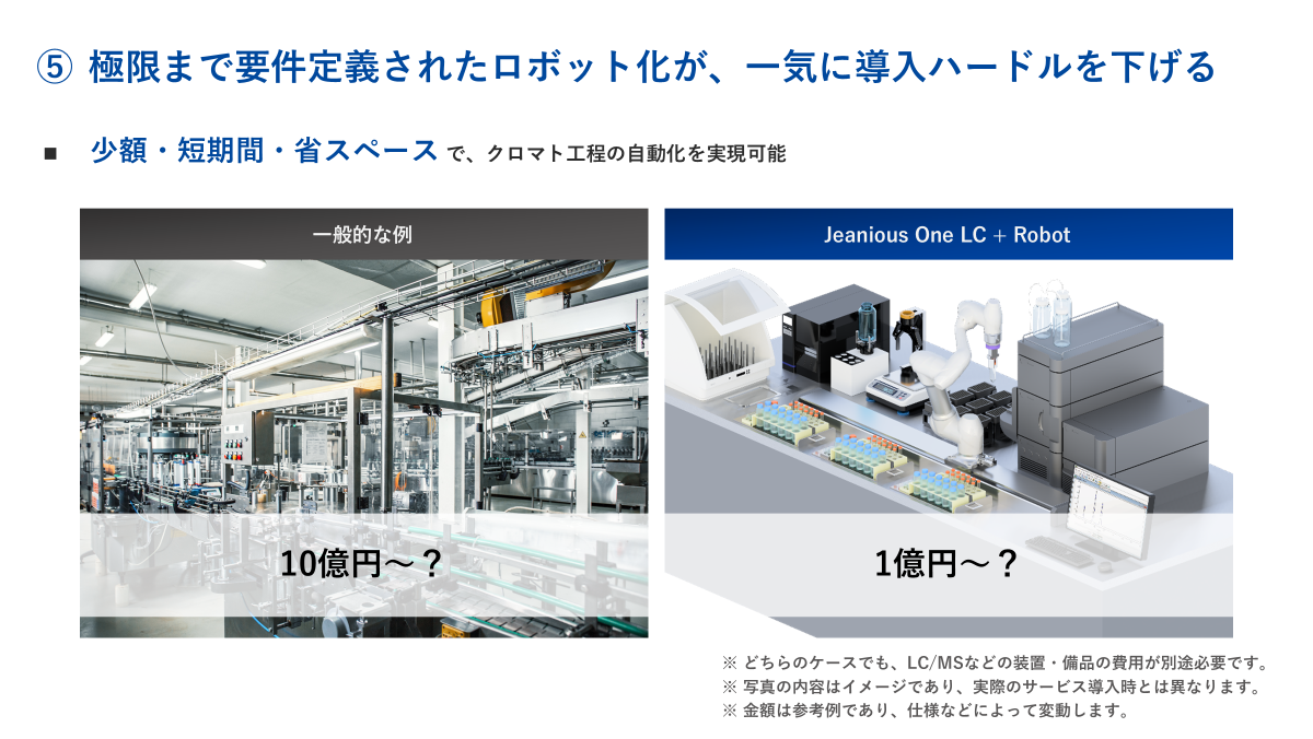 分析・分取の自動化では、一般的に、HPLCなどの液体クロマトグラフィー装置は別として、おそらく数億円から数十億円を要します。いわゆる産業用ロボットを使用し、実験室の整備・工事なども行い、何年もかけて導入することになります。