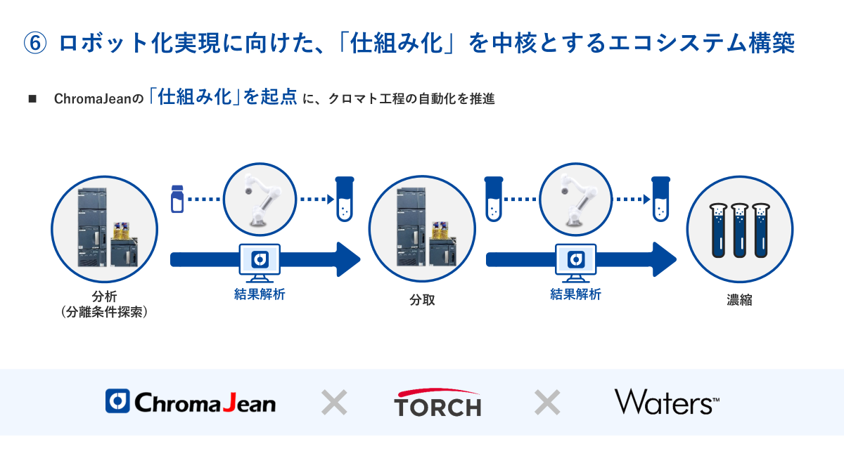 協働ロボットの開発で信頼と実績を築いたトーチ社、液体クロマトグラフィー装置メーカーとして最大手であるWatersの日本法人日本ウォーターズと連携して、3社で「前人未踏のクロマト工程全体の完全自動化」を可能にします。現在、複数のお客様から問い合わせをいただいております。