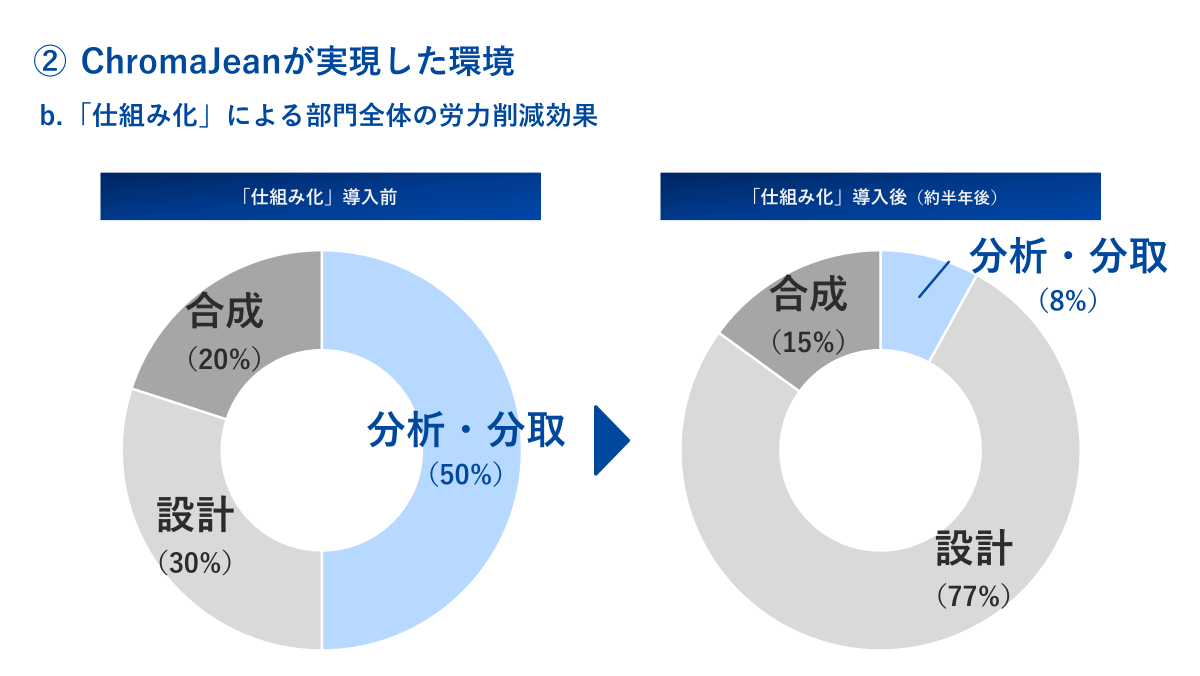 下図に示したのは、お客様の研究現場に「仕組み化」を導入した前後で、有機合成部門全体としてクロマト工程にかかる労力削減効果を計測したものです。